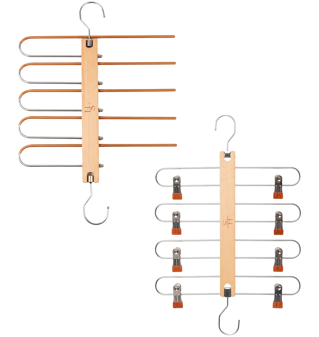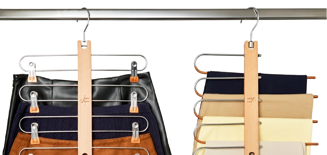 Ready to cure your crowded closets with an elegant storage system? When fashion demands space, our HangSage Pants & Skirts Hangers deliver. Where HangSage Pants Hangers use a five-tier vertical folding system to store bulky sweats and slacks, HangSage Skirts Hangers clip and collapse up to four skirts at a time.