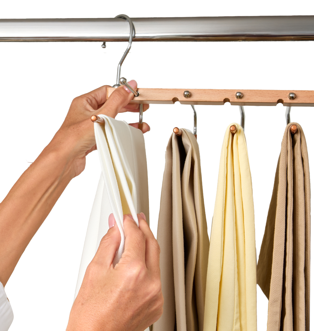 With HangSage Pants & Skirts Hangers, your tidying won’t stop at slacks and wraps. Whether your wardrobe is full of scarves, activewear, shawls, coveralls, cut-offs, or accessories, HangSage Hangers will compress your clothing clutter in a single drop.