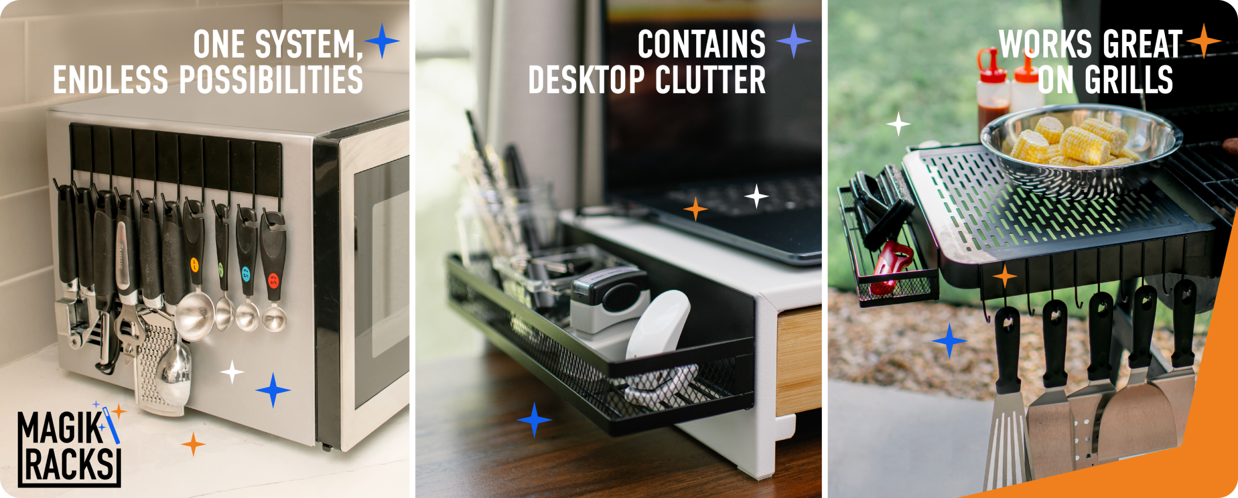 - Quick Installation Makes Enchanting Every Room Easy: Magik Racks and their toolless, unbox-and-stick installation are easy to set up around the house, moving from your office to your kitchen to your garage faster than you can say “Abracadabra.”