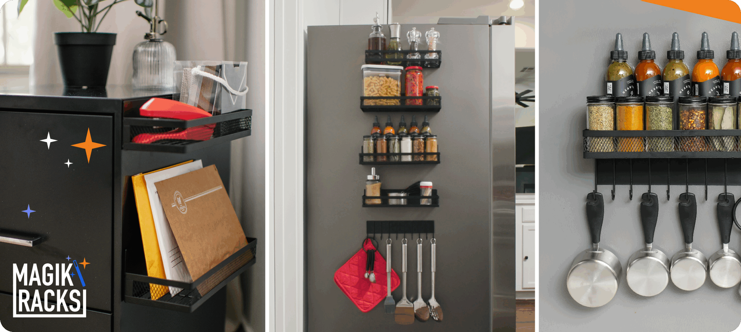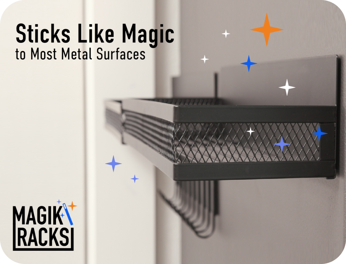 Magik Racks Magnetic Shelves stick like magic to most metal surfaces thanks to industrial-grade magnets. You can slip the shelves straight out of the box and onto your stove, washing machine, microwave, grill, and more.